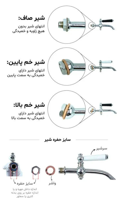 در برخی مدلها، شیر بلندتری که جنس خوب دارد (برنجی، آبکاری شده، استیل ضدزنگ) جلوهی زیباتری میدهد؛ هماهنگتر با دکور، ظاهر کتری یا سماور. �